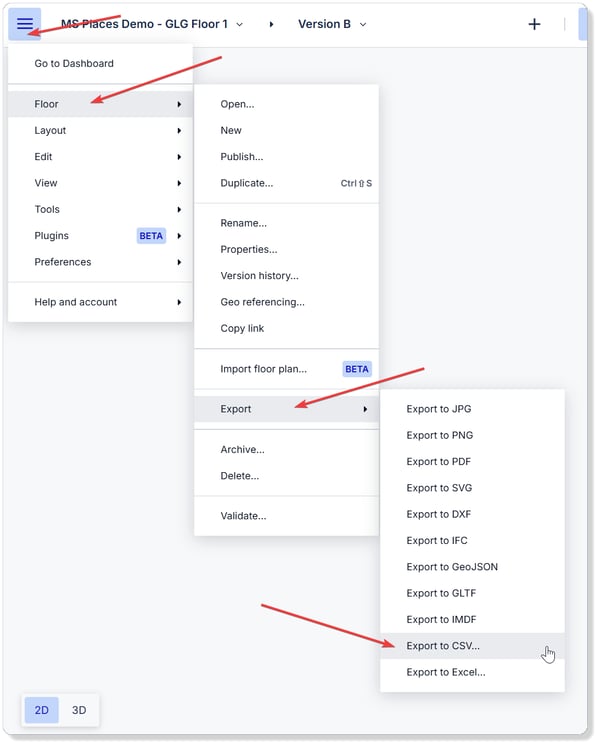 Then open the main menu and select Floor > Export > Export CSV.