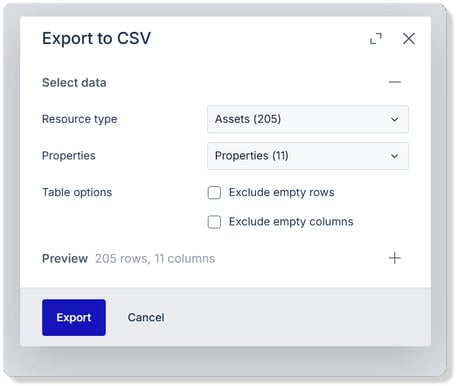 First, you have to select the Resource type you wish to export. Do this by left-clicking the first drop-down menu and selecting either Assets, Spaces, or Products.