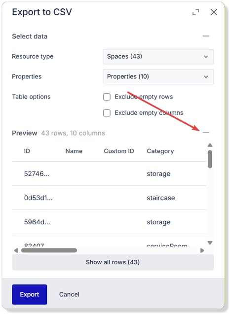 After setting up which data you wish to export you can click the + button to see a preview of the CSV list. Click the - button to hide the preview again.